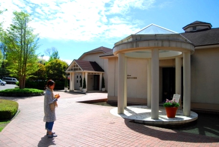 午前中の光。 空の青に白い建物が映える 一碧湖香りの美術館。
