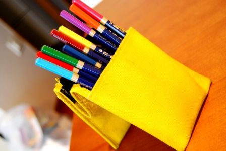 こうしてペンたてにもなるすぐれもの。 今でも趣味のお絵かき用ペンケースとしてバリバリ現役。